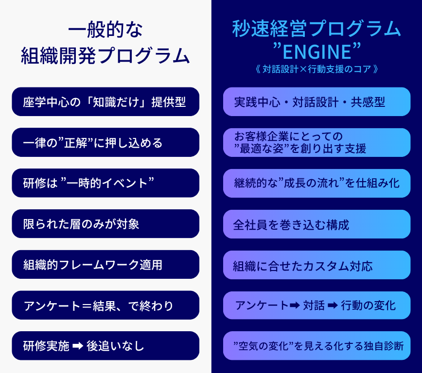 経営と現場を、“止まらせない”組織へ。意思決定と実行が加速する対話型・実践型の組織変革プログラムです。