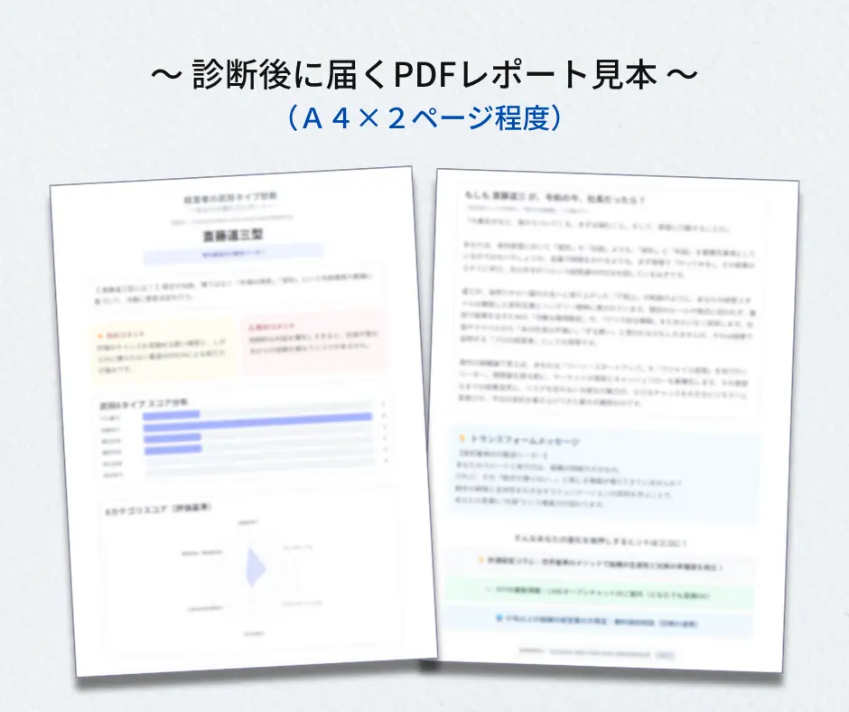 ●メインタイプの武将解説●武将タイプ分布グラフ +6つの診断軸のレーダーチャート●戦国×経営ストーリーのショートコラム●今すぐ試せる“最初の一手”💡